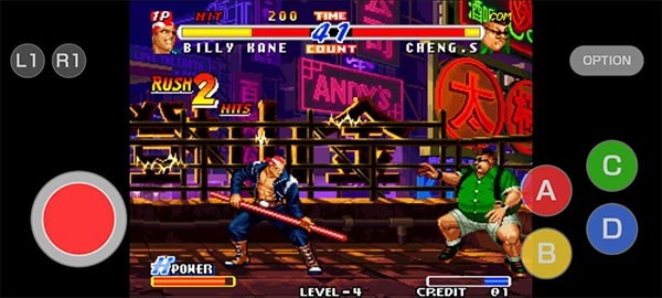 1、首先下载安装好饿狼传说2,点击左上角的L1进行投币,点击右边的A按键进入游戏。
