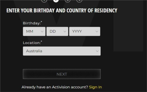 步骤四:分别选择生日时间-月、日、年(确保成年)并选择所在地(建议选择澳大利亚 Austrilia)