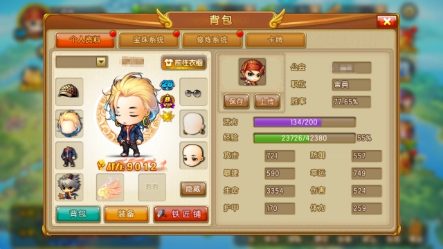 1、通过个人资料可以查看到角色的武器、装备、基本属性等;背包内可以保存各种物品,还可将不需要的物品进行精炼。