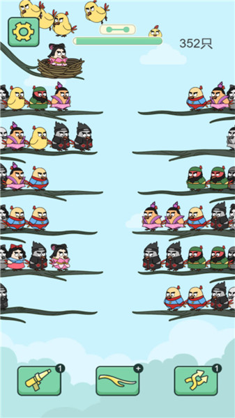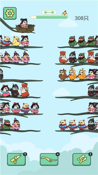 1. 把相同类型且颜色一致的小鸟移动到同一树杈即可消除,这主要考验玩家的观察能力。此外,游戏中还提供了诸多小道具供玩家使用,能让你更便捷地进行游玩。