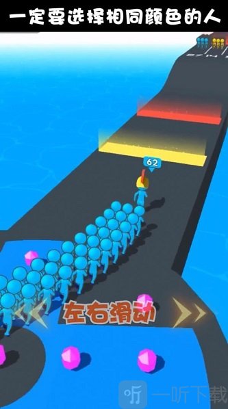 《一起来冲锋》是一款操作极其简单、可玩性极高的休闲跑酷类游戏。其玩法丰富多样,玩家在场景中跑酷过程中,要不断召集与自身颜色相同的小人,组建起一支规模庞大的队伍。关卡结束时,玩家队伍的阵容越庞大,所获奖励就越丰厚。