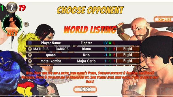 玩家能够灵活地操控角色,在游戏里迎接并完成各类打斗挑战。整个游戏弥漫着紧张刺激的氛围,让人不禁回忆起童年时期的拳皇游戏。游戏中,每个角色都独具特色的打斗技能,玩家可依据自身喜好来挑选角色。在游戏过程中,玩家凭借所选角色将一个个对手击败,以此证明自己的实力。