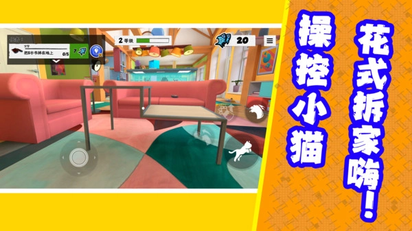 1.左下角的圆形虚拟摇杆是角色的移动控制器,玩家通过拖动它来操控猫咪在房间中自由走动探索。