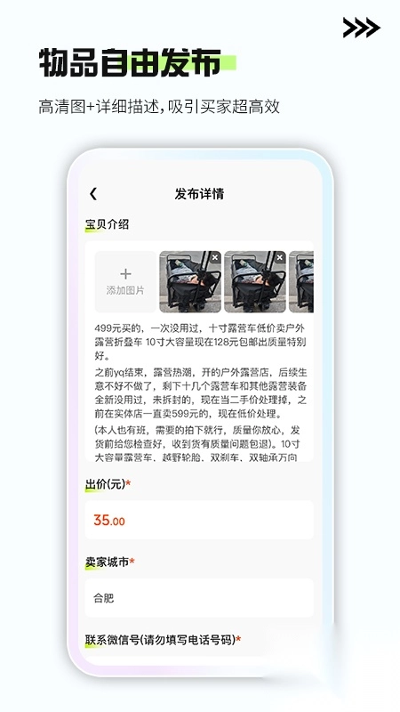 1. 直接连接买卖双方,无需通过平台下单,让沟通变得更高效,交易更加自由。 2. 只需拍照上传闲置物品,一键即可发布,能迅速展示商品,吸引潜在买家。
