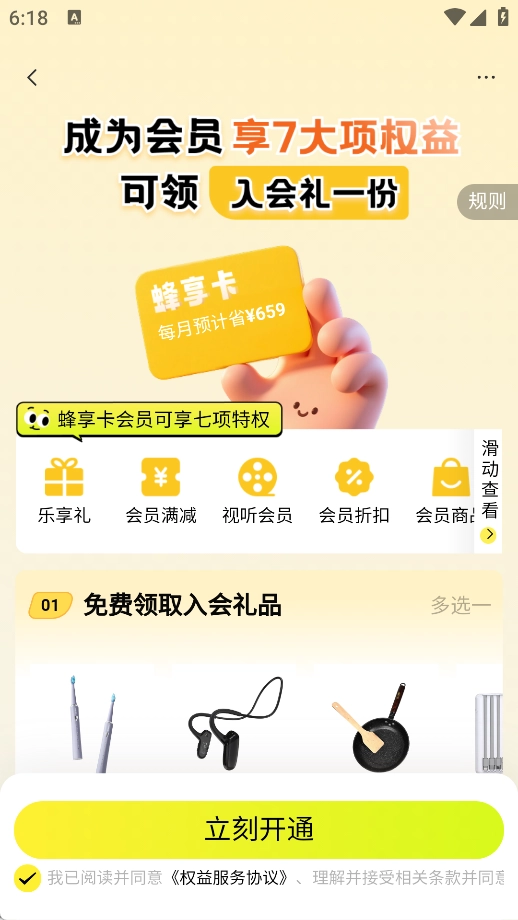 3、只需点击峰享卡,就能完成开通操作。开通之后,你将享有七项特权,帮你轻松省下更多钱。