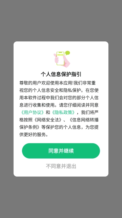 确认个人信息保护指引查看,同意并继续,进入软件。