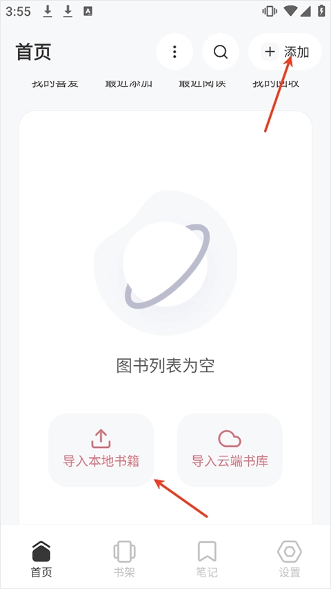 2. 导入书籍的操作方式为:点击右上角的添加按钮。首次使用时,首页中央区域会出现“导入本地书籍”按钮,点击该按钮即可完成导入。