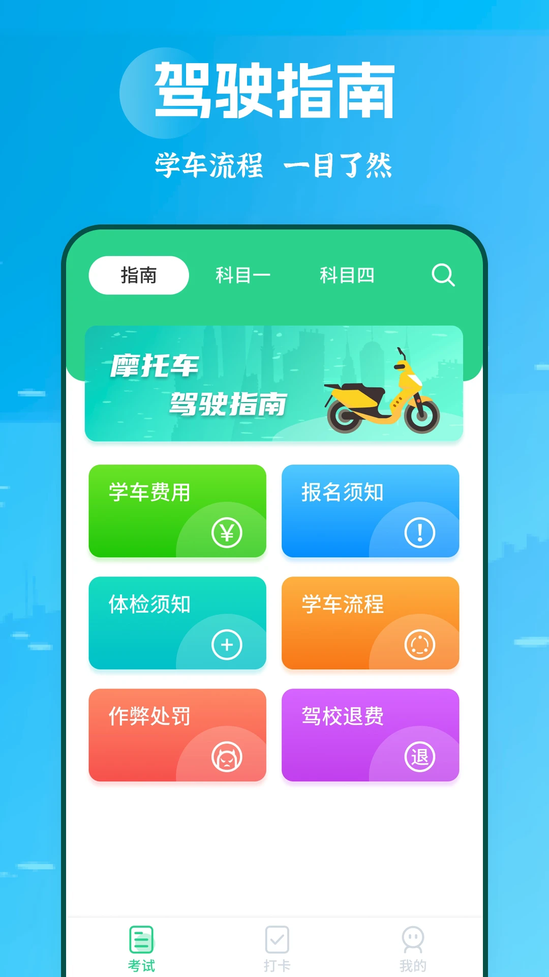 为你呈现摩托车驾考需知晓的各项内容,涵盖报名注意事项、学车流程、学车费用、体检相关事宜以及关于作弊的情况等。