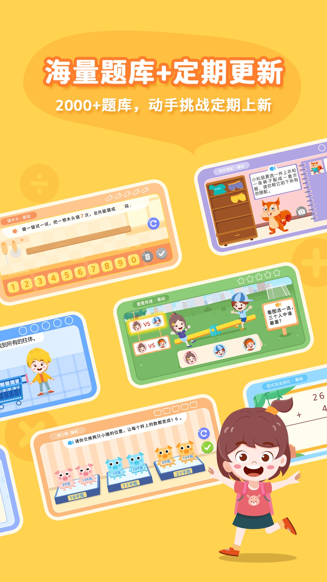 4. 海量题库,定期更新:每日闯关用心构建了超2000道题目的题库,且更新脚步从未停歇,全面涵盖低年级孩子所需掌握的思维知识。不仅如此,各类别出心裁的动手挑战也会定期推出,从多个角度、以多种方式陪伴孩子拓宽思维边界。