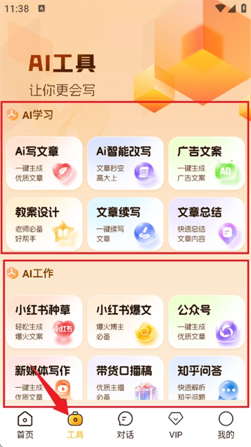 3、进入【工具】界面,如以下图示,能看到众多写作工具,像AI写文章、智能改写、广告文案、教案设计等等。