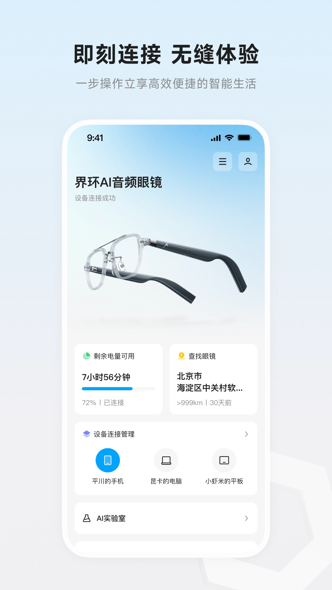 借助简洁便捷的操作界面,你能够轻松实现与眼镜的连接及管理,畅享无间断的智能生活体验。