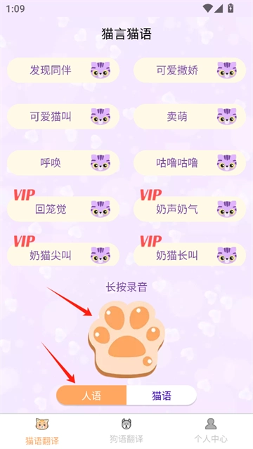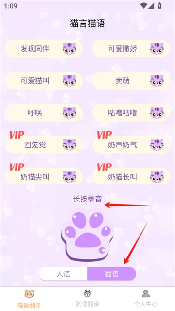 1. 启动软件,找到并点击“猫语翻译”功能。若您是人,想与猫交流说话,就点击“人语”选项,接着长按进行录音,完成后播放时,您录制的声音就会转化为猫叫声。