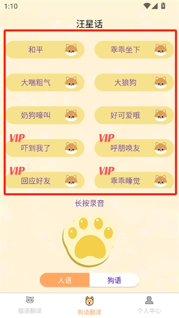 3、汪星话,跟狗狗说话聊天亦是如此,可点击上面的按钮发出不同的声音。