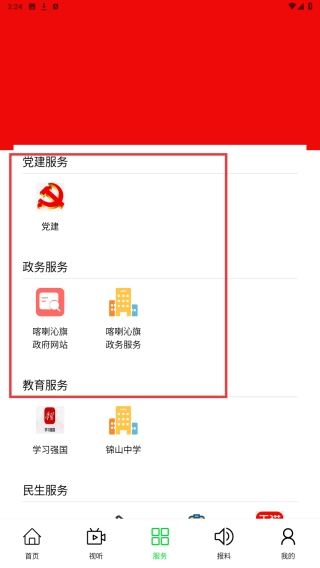 3、服务页可使用【党建】【喀喇沁旗政府网站】等功能。