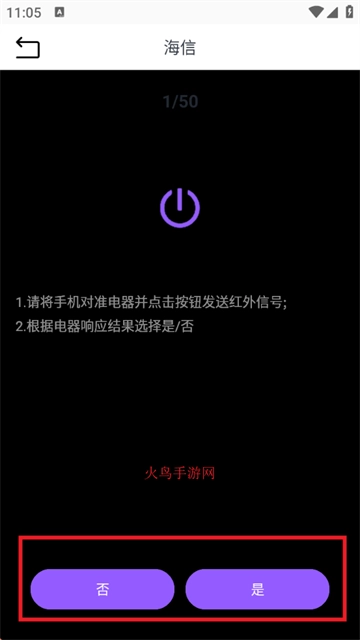 5、请将手机对准电器,然后点击按钮发送红外信号。若电器有反应,就点击“是”;若没有反应,则点击“否”。