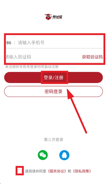跳转到登录界面,在相应位置输入手机号与验证码,同时勾选“请阅读并同意 《服务协议》 和 《隐私政策》”,随后点击“登录/注册”按钮就能完成操作。