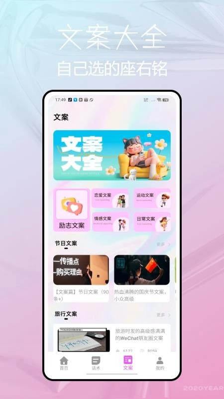 文案资源涵盖多种主题类型,像旅行文案、节日文案、励志文案、情感文案等都包含在内。