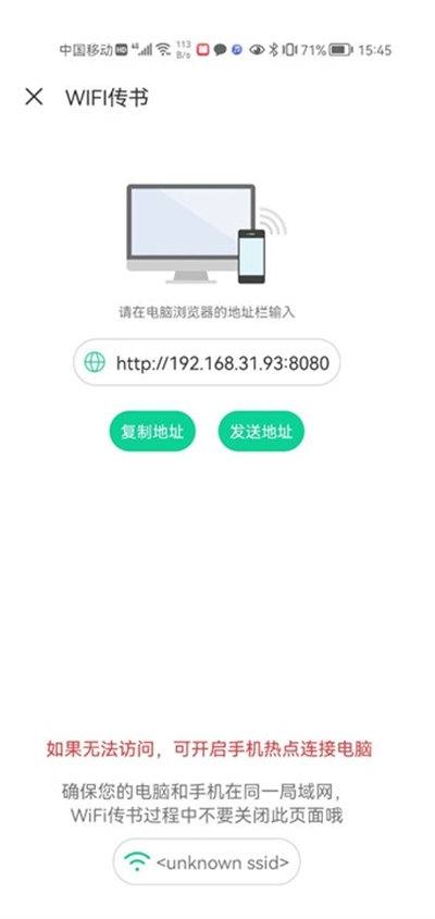 4、若您选择WiFi传书,需保证您的电脑与手机处于同一局域网内。在WiFi传书期间,请不要关闭此页面。要是出现无法访问的情况,您可以开启手机热点来连接电脑。