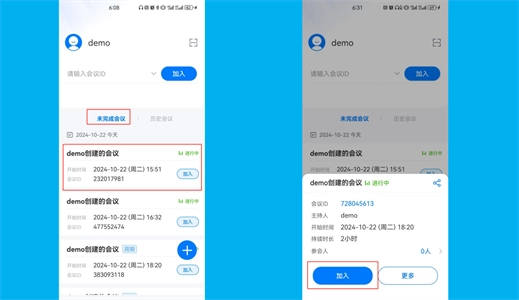 ①您所创建、受邀或参与过的所有会议,都会被列入会议列表。您能够前往首页的“未完成会议”板块,点击状态显示为“进行中”的会议,打开弹窗以查看会议详细信息,同时还能点击弹窗内的“入会”按钮来加入会议。