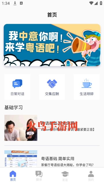 零基础学粤语的基础粤语教学,内容涵盖日常对话、交际应酬、生活琐事,还提供粤语词典、粤语翻译等。