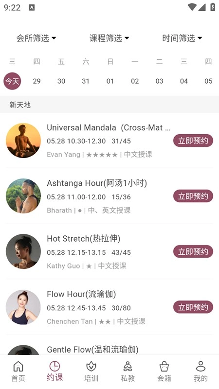 1. 课程预约:能够查看不同门店、不同元素的课程信息。可依据全部时段对课程进行筛选,便于用户规划时间。