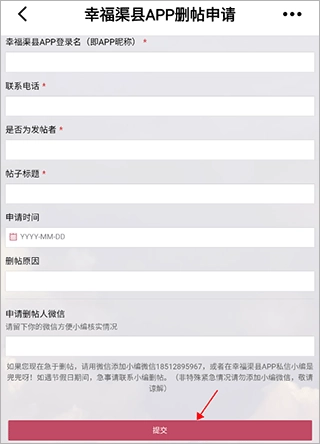2. 进入界面之后,依次填写姓名、昵称、帖子标题以及删帖原因等相关信息,完成填写后点击提交就行。