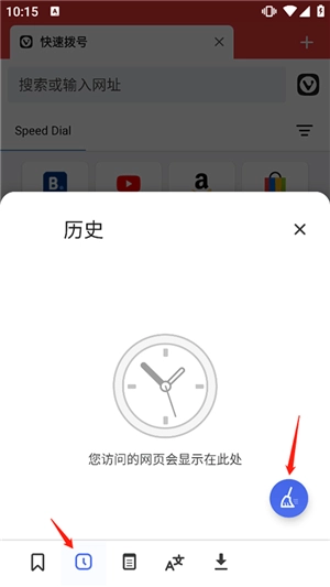 2、打开后将页面切换到历史记录界面,并点击蓝色扫把图标
