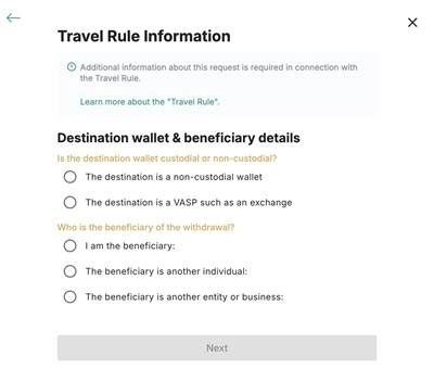 3、提供 Travel Rule 信息,然后单击 Next。