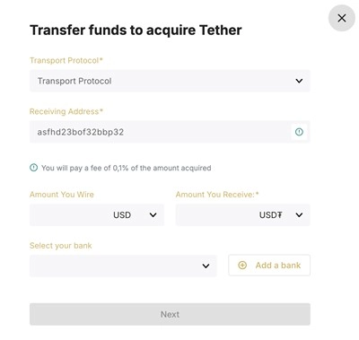2、挑选网络协议,填入您期望接收Tether代币的钱包地址,以及打算汇入Tether的法定货币总金额。请选择即将接收的Tether代币与即将进行电汇的银行账户,之后点击下一步。