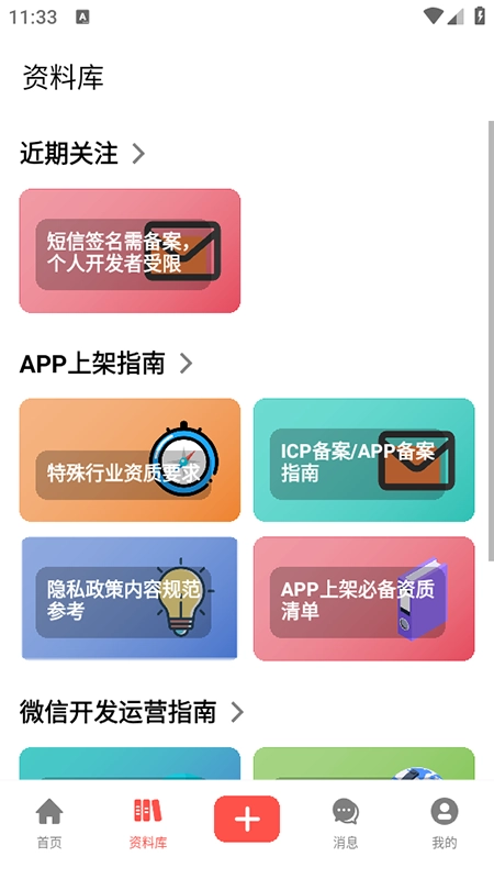 3、资料库查询:这里拥有丰富资料,涵盖上架指南、ICP备案相关知识、微信开发运营指南以及网站开办指南等内容,极大地方便了开发者获取所需信息。