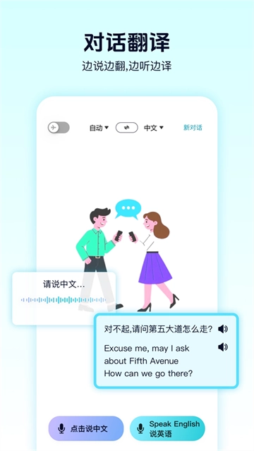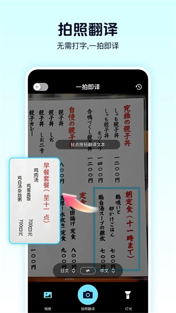 拍照翻译功能:只需对准菜单、路牌、说明书进行实时取景,即可实现图文版式的智能还原,还支持通过放大镜进行细节校对。
