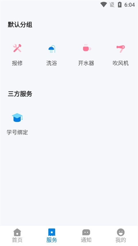 3、进入“服务”页面,点击“洗浴”选项,开启蓝牙功能,搜索设备,在搜索结果中挑选对应寝室的设备,随后即可开始使用。