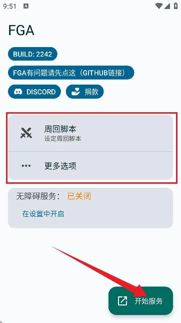 8、选定脚本功能后,点击“开始服务”,接着按照提示赋予软件必要权限,具体如【请让此程序显示在其他应用程序上层,FGA需启用此设定以显示控制按钮】所示。