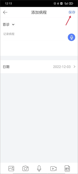 (3)接下来添加病程,即记录首诊期间的完整过程,填写完毕后点击右上角的“保存”按钮。