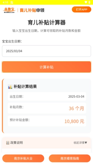 育儿补贴申领计算器堪称一款极为实用的计算工具。它能够助力用户迅速算出可申领的育儿补贴数额,同时还会给予全流程的申领指导。此计算器依据国家以及地方的最新育儿补贴政策,综合用户所输入的子女出生日期、户籍所在地、家庭结构等相关信息,精确匹配补贴规则,进而生成个性化的补贴金额与申领方案。