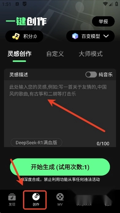 然后用户们可以在创作页面输入自己的音乐创作灵感,再点击“开始生成”,快速生成音乐视频