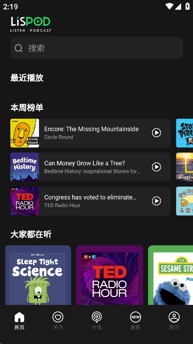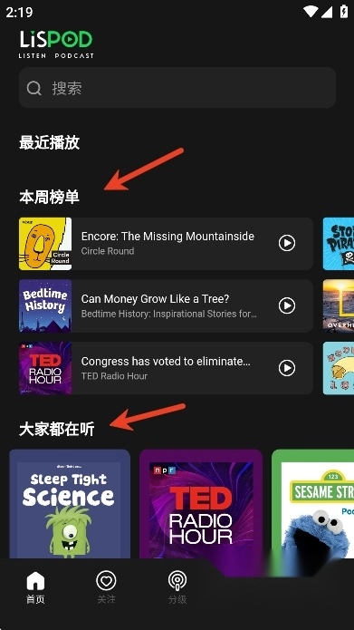 打开,用户们可以在首页收听到最新最热门的播客节目