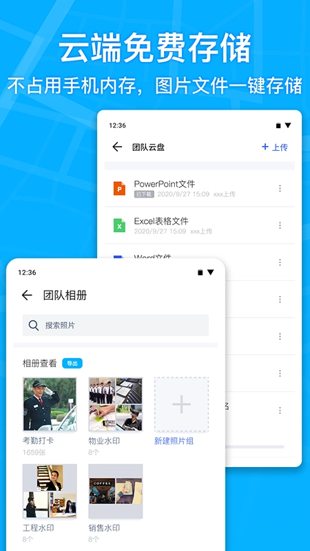 用户能够创建团队,团队成员带有水印的照片会自动上传,这极大地方便了团队协作。如此一来,既节省了团队成员手机的存储空间,又提高了工作效率。