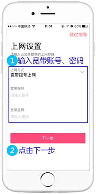 4、进行上网参数设置,点击“确定”后将跳转到以下页面。此时,路由器会自动检测上网方式。若检测到的上网方式是“宽带拨号上网”,请在相应设置框内输入运营商提供的宽带账号及密码,然后点击“下一步”。需注意,76%的用户因输错宽带账号或密码而无法上网,所以请仔细检查输入的宽带账号和密码是否准确,要留意区分中英文输入、字母大小写以及后缀是否完整等情况。倘若不确定,可咨询宽带运营商。请依照向导的提示进行操作,要是上网方式检测为“自动获取IP地址”,直接点击“下一步”;若检测为“固定IP地址”上网,填写好对应参数后再点击“下一步”。