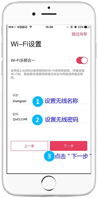 5、进行无线参数设置,点击“下一步”后进入无线参数设置页面,在此页面设置无线名称与无线密码。需注意:无线名称最好设置为字母或数字形式,不推荐使用中文(因为部分无线客户端可能搜索不到中文无线名称,或者无法连接);无线密码建议设置得具有一定复杂度,例如采用字母与数字组合的形式。