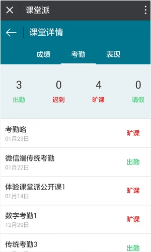 2、在考勤模块,显示每次考勤的状态,并统计出学生出勤,迟到,旷课,请假的次数;