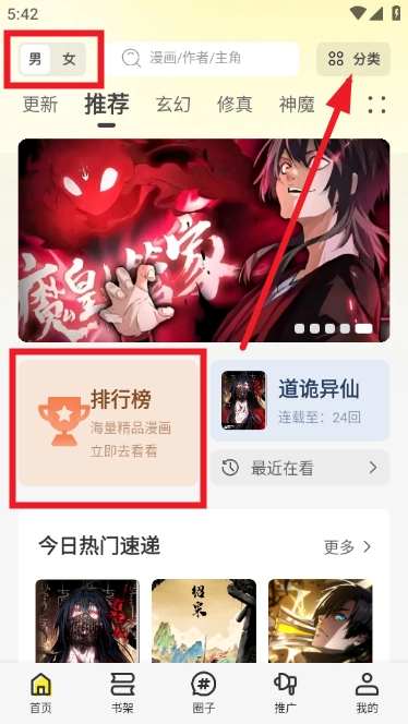 1. 软件内所有漫画统统免费。进入软件,大家能够随意切换男女模式,同时设有分类,方便筛选心仪漫画,另外还能查看排行榜等。