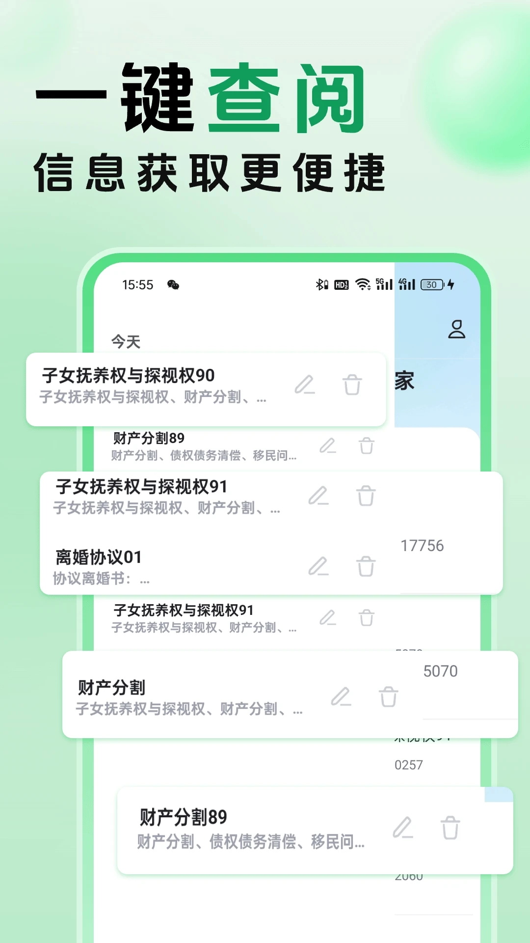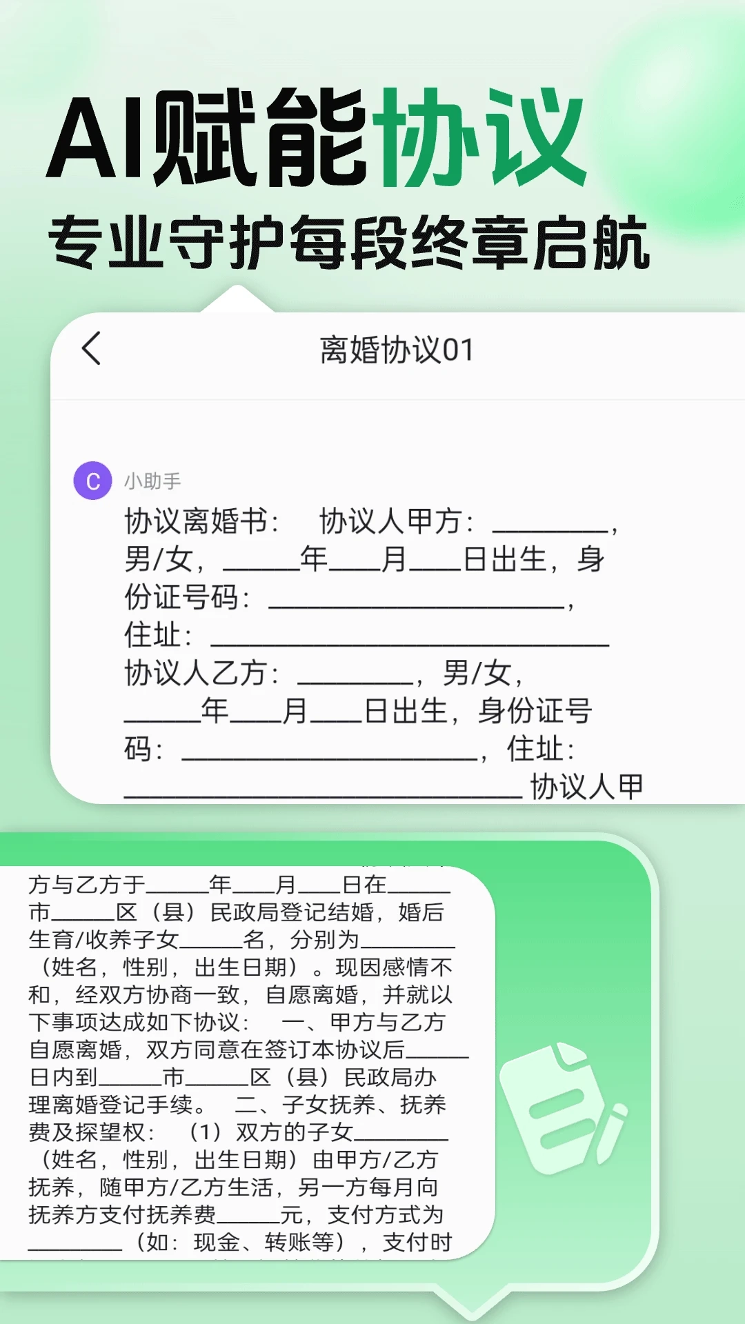 离婚协议App,专为有离婚诉求的朋友精心打造。这款App内拥有海量离婚协议模板,内容全面,包含财产分割、子女抚养权与探视权、子女财务支持、房屋使用权、退还婚前财产、债务分担等诸多方面,能够适配各种不同情形,一站式满足大家的需求,快来体验吧!