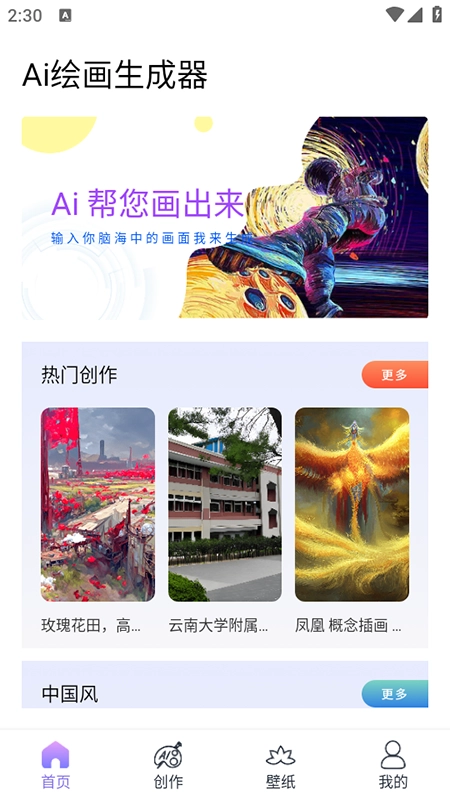 AI绘画绘图大师作为一款AI绘画生成器,能依据软件内用户的描述,快速生成多种风格的绘画,像中国风、热门漫画、黑白写意、像素风等皆能实现。而且,软件中还储备了大量壁纸,方便用户挑选使用。