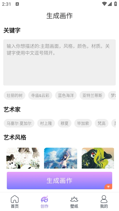 2. 在创作板块的输入框里描述关键字,并挑选相应的艺术风格。
