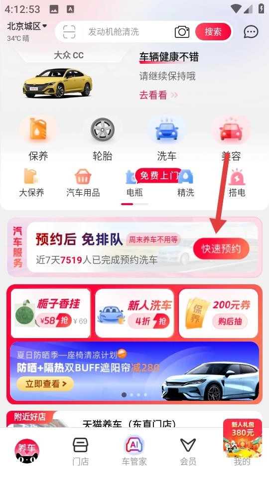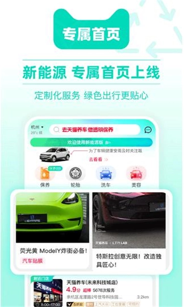 1. 于本站获取天猫养车最新版本后启动软件,在首页能够看到软件提供了诸如保养、轮胎、洗车、美容等多种服务。