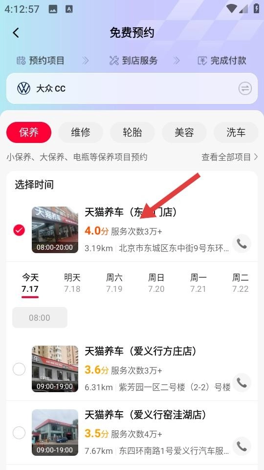 2、在免费预约页面,你可以选择保养等项目。页面会展示多家门店的评分、距离以及营业时间。你能够选定日期和时段,确认无误后点击“立即预约”,这一设计简化了养车服务的预约流程,使你到店更加高效。
