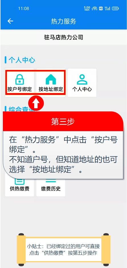 第三步:新用户依据自身实际情况挑选绑定方式,若已绑定,则能直接点击“供热缴费”,并按照第六步的方式进行操作。