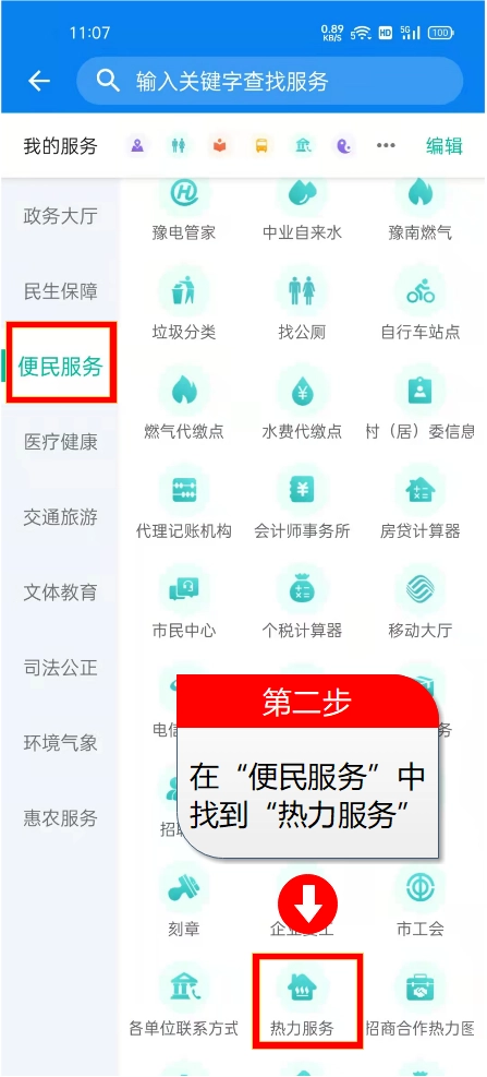 第二步:在服务菜单中依次点击“便民服务”-“热力服务”。