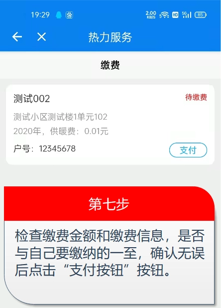 第七步:于主页点击“供热缴费”按钮,从而进入缴费页面。当进入“缴费”页面后,仔细检查缴费金额与缴费信息,在确认均无误的情况下,点击“支付”按钮。